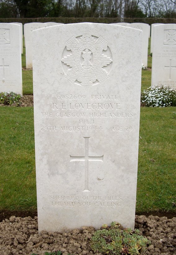 Grave VI.B.5. Son of C. Lovegrove, and of Maude A. Lovegrove, and stepson of C. G. Rhodes, of Lange Baan Weg, Cape Province. Husband of Mary Lovegrove (Source C.W.G.C.). 2nd Battalion, The Glasgow Highlanders, Highland Light Infantry |