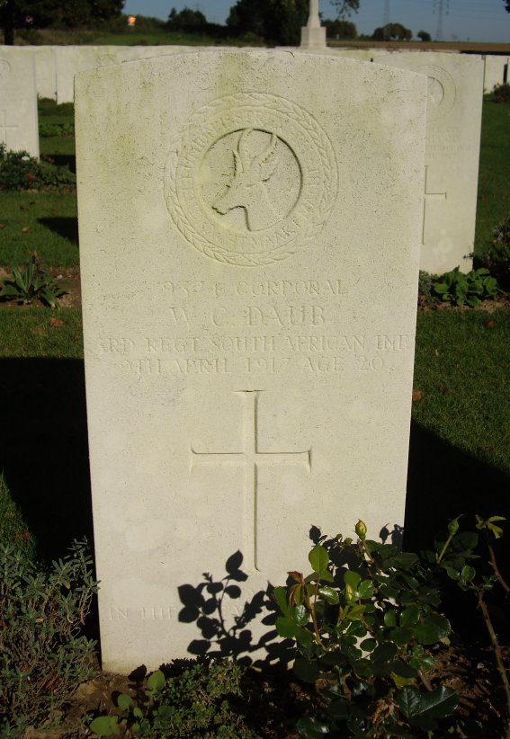 Grave I.B.16. Son of August and Ena Daub (Source : C.W.G.C.). Killed in action on the 9th April 1917 during the attack of Black Line and Blue line to the North-East of St Laurent-Blangy. The 3rd S.A.I. lost 279 men (Killed and wounded). |