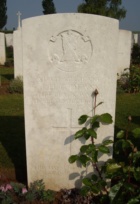 Grave II.D.24. Son of John and Eliza E. Deans, of Bethal, Transvaal. Native of Heidelberg, Transvaal (Source C.W.G.C.) 1st Battalion, The Black Watch (1st Brigade, 1st Division) Killed in action on the 25th September 1916. Age 26. Attack at the North of Flers village. 119 casualties. |
