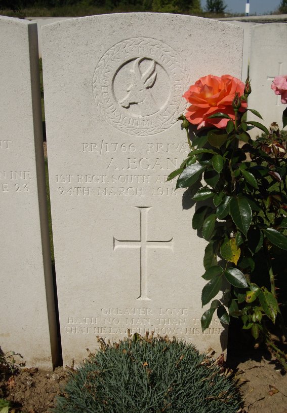 Grave XII.H.5. Son of Thomas and Martha Egan, of Pietermaritzburg, Natal (Source : C.W.G.C.). 1st S.A.I., Rhodesian Company. Died on the 24th March 1918. Age 38. |