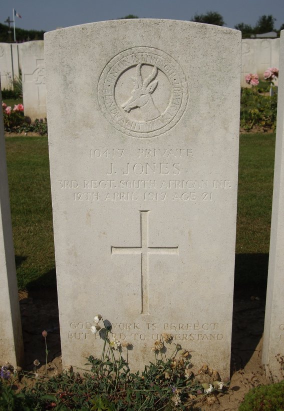 Grave II.A.20. Son of Mr and Mrs WR Jones, of Barbeton,Transvaal (Source : C.W.G.C.). Died of wounds on the 12th April 1917. |
