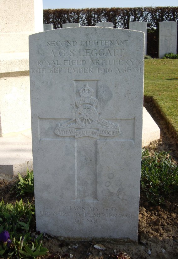 Grave C22. Son of Ashley Leggatt, MD. Husband of Ada Leggatt, of 30, Manchester St, Manchester Square, London. Also served in South African Rebellion, 1906 (Source : C.W.G.C.). Registered on the Roll of South Africans who fell 1914-1918 edited after the War by the South African authorities. C Battery, 47th Brigade, Royal Field Artillery (14th Light Infantry) Killed in action on the 16th September 1916. |