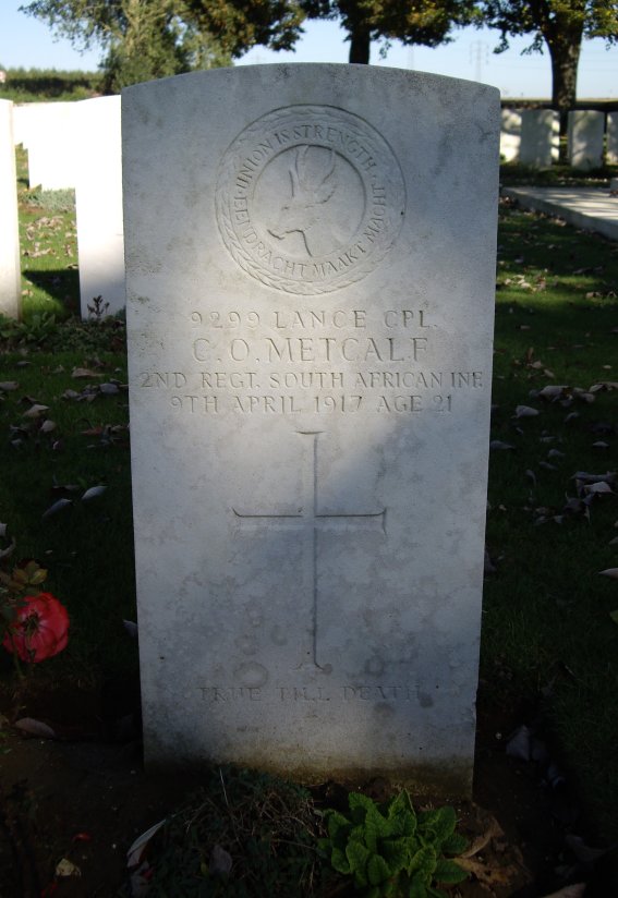 Grave III.H.18. Son of the Reverend J and A Metcalf, of Glenau, Estcourt, Natal (Source : C.W.G.C.). Killed in action on the 9th April 1917 during the attack of Brown Line to the North of Athies. The 2nd S.A.I. lost 88 men (Killed and wounded). |