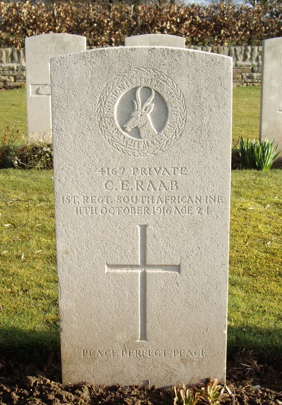 Grave B.9. Son of Mrs AE Raab, of 9, Park Lane, Uitenhage, Cape Province, and the late AJ Raab (Source : C.W.G.C.). Killed in action. Operations in front the Butte de Warlencourt. |