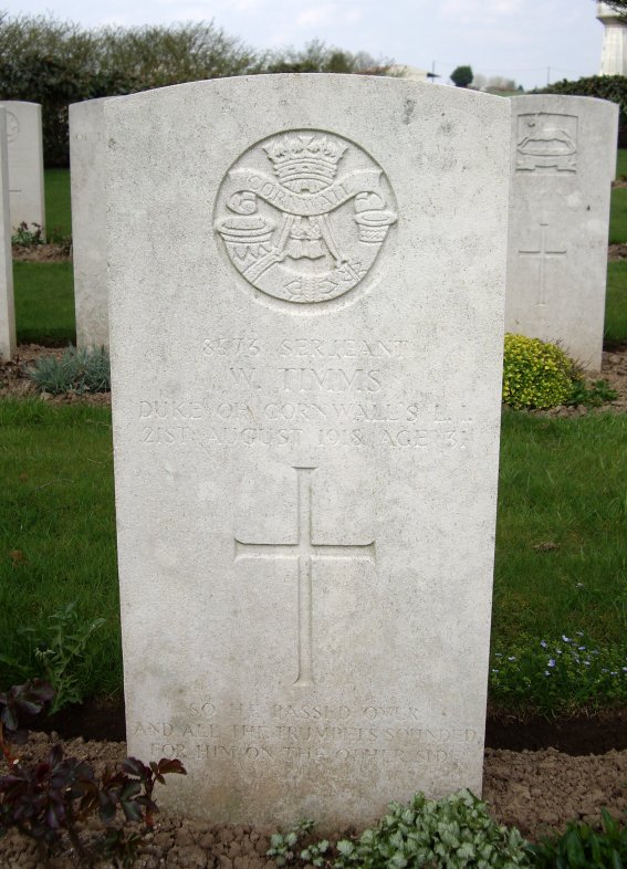 Grave III.C.4. Son of William and Martha Timms. Husband of Kathleen V. Timms, of 88, Russell St, Durban, Natal. Born in Warwickshire.l (Source : C.W.G.C.). 95th Brigade /5 th Division. Attack on Achiet-le-Petit (Battle of Albert). |
