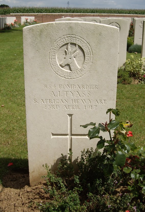 Grave IV.C.1. 125th Siege Battery, South African Heavy Artillery Killed in action on the 23rd April 1917. The 125th Battery went forward a mile East of Tilloy-les-Mofflaines on the 16th April 1917. Here it was much exposed and three days later it moved back to the wood of Tilloy where its guns were constantly in action by day and night. |
